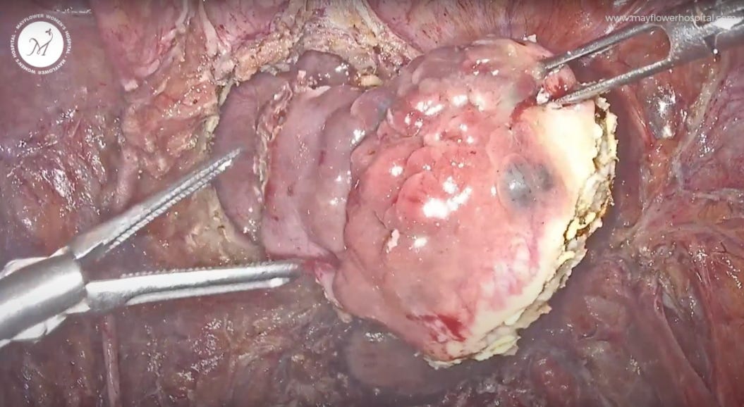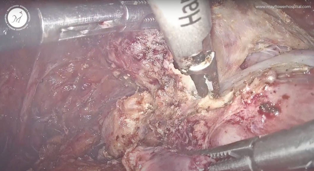 Sometimes we will have to take a bold step in order to create a space for dissection. Doing so we take a part of the nodule towards the bladder and the other towards the uterus.