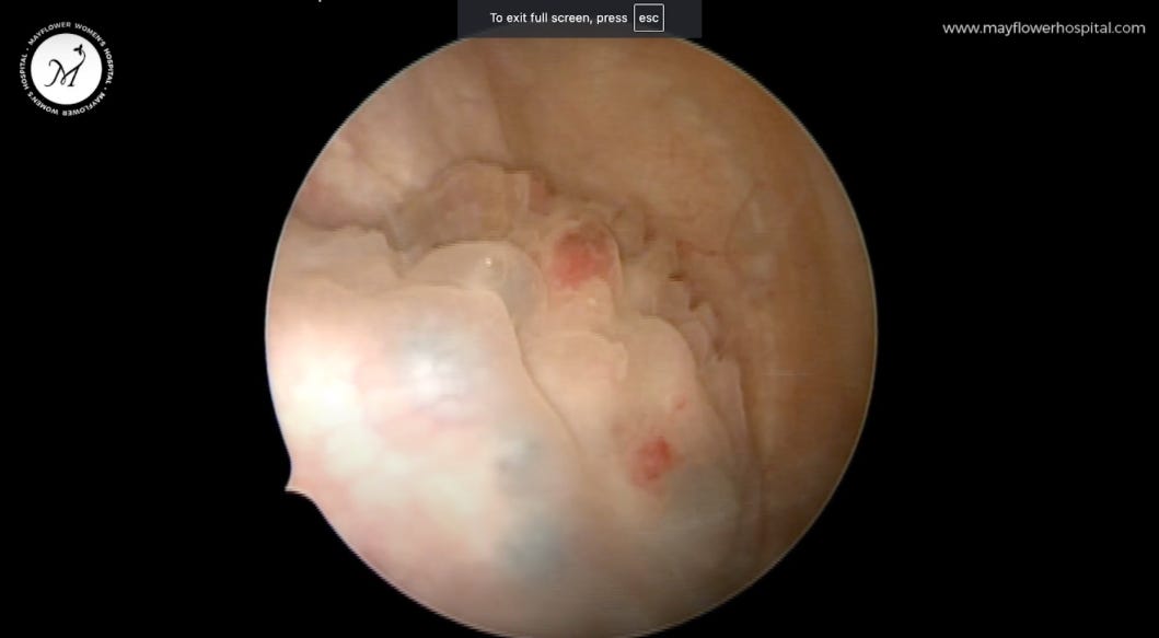 Alright, let’s jump in now. Once we’ve mapped the disease, we must confirm it. Surgery begins with a cystoscopic view from inside the bladder where we mark the disease.