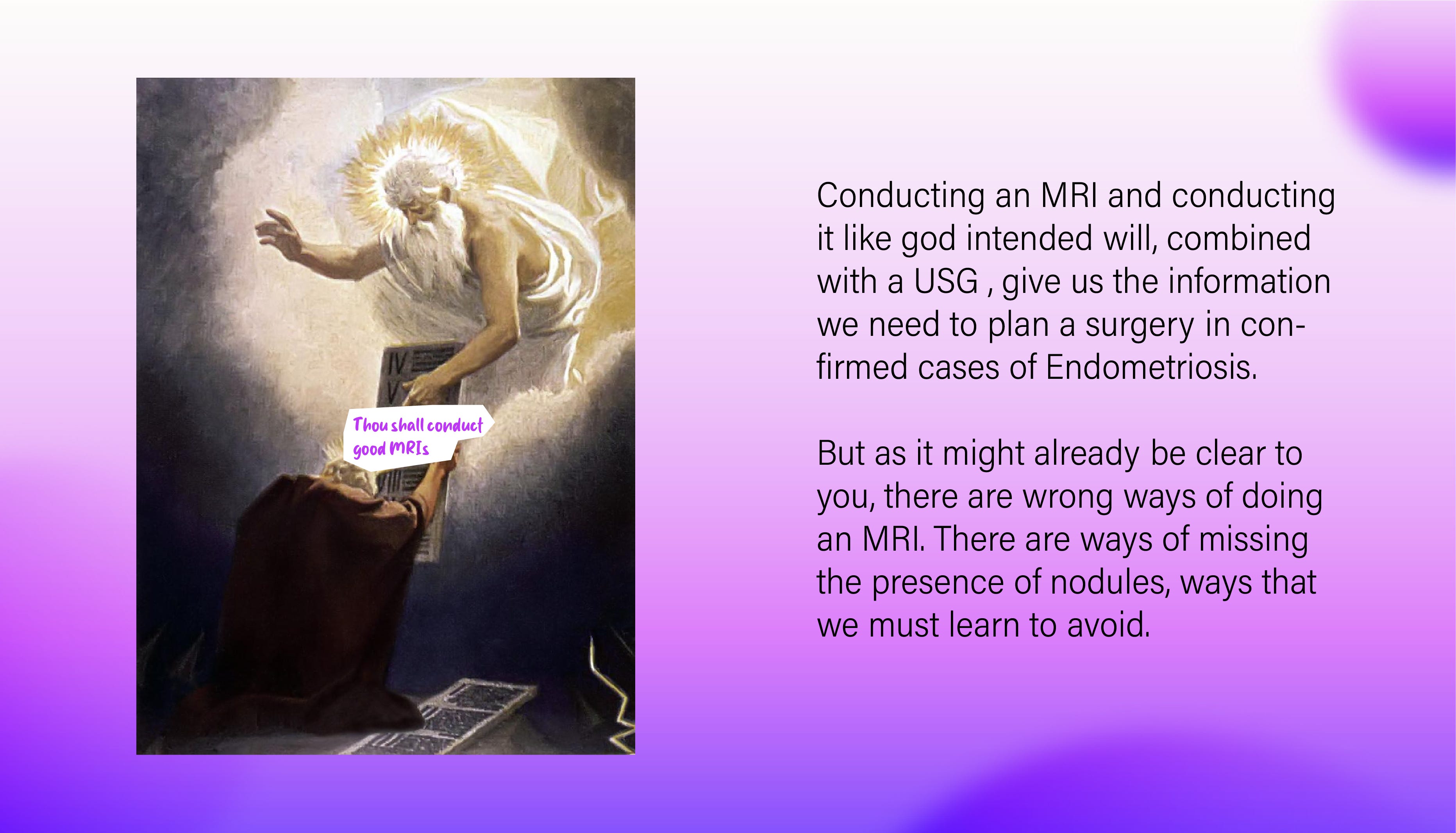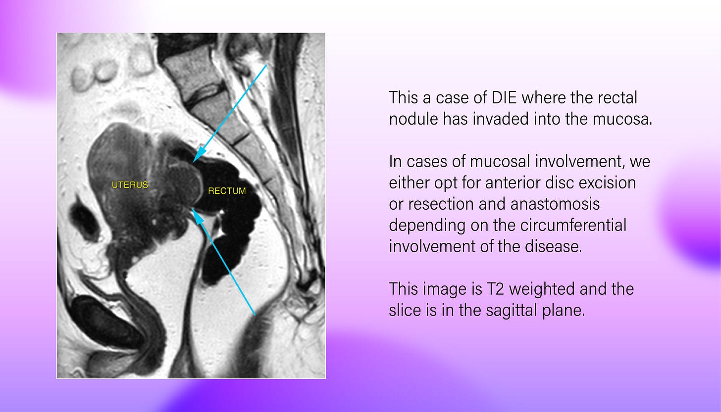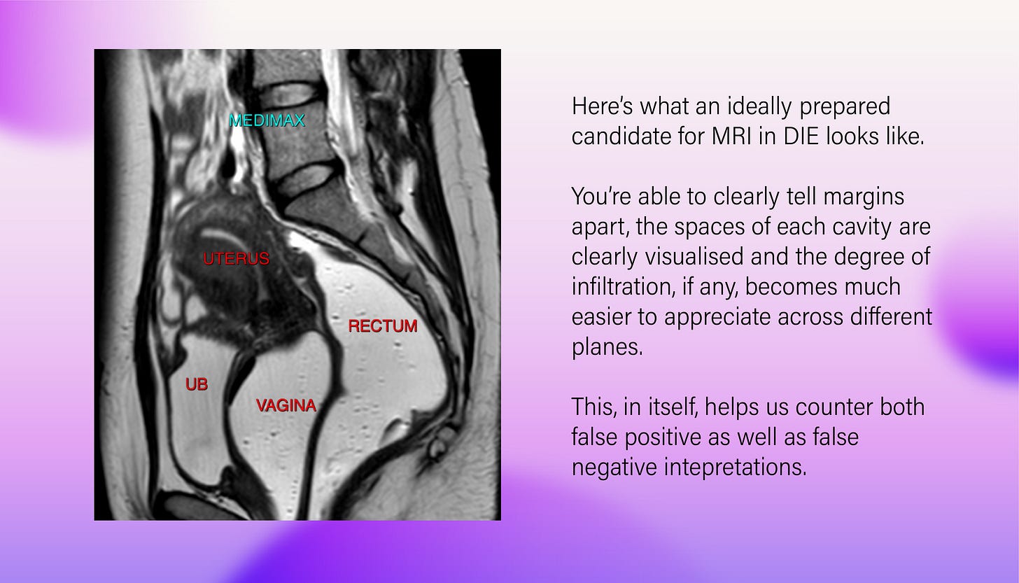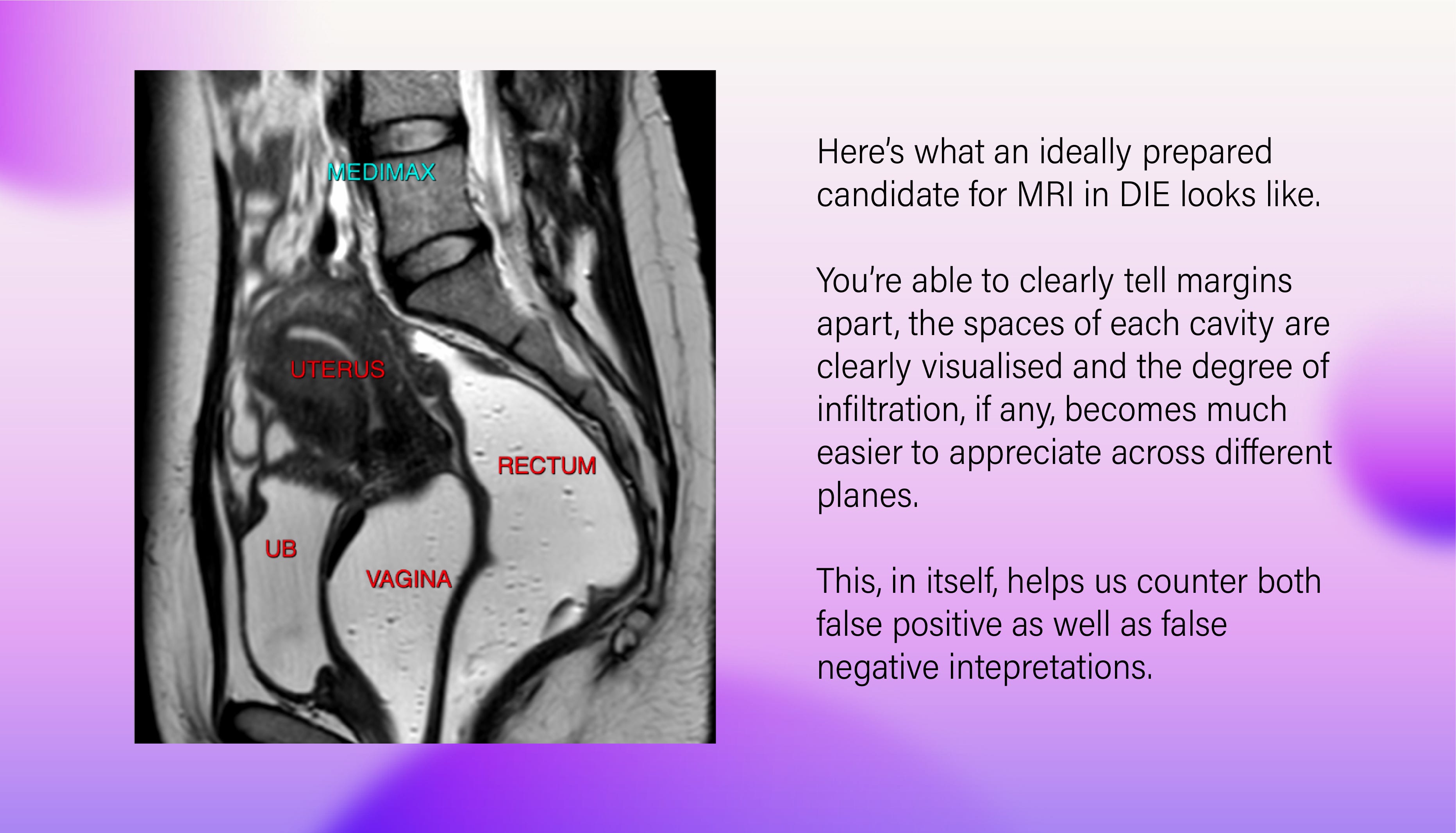 Once the setup is right, MRI can provide us incredible details about disease involvement and the level of infiltration. This becomes most useful in our pursuit of detecting infiltration of DIE in various cases.